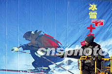 一名工人五日在哈爾濱街頭張掛冰雪運動宣傳畫,為五日晚在這里開幕的國第十屆冬季運動會暨第十九屆哈爾濱國際冰雪節(jié)造勢。作者:毛建軍