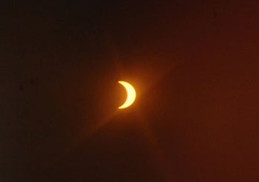 22日晨,綿陽上空萬里無云,非常晴朗。太陽照常升起,直到8點20分鐘左右,突然發(fā)現(xiàn)太陽上半端出現(xiàn)一個缺口,缺口越來越大,到8點55分左右,基本上只有少半個月亮大小。天色轉暗,天氣轉涼,城市路燈全部打開。隨后,一大片烏云籠罩在綿陽城的上空,把太陽完全遮蔽,直到59分時,太陽從烏云里露出來,完全就是一個上弦月形狀。瞬間,又隱入烏云中。