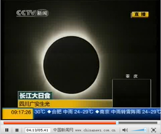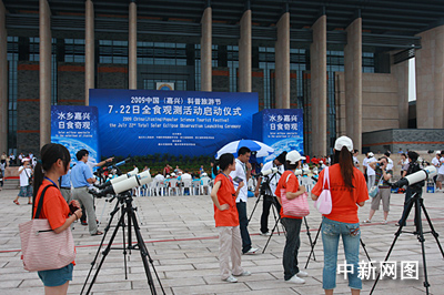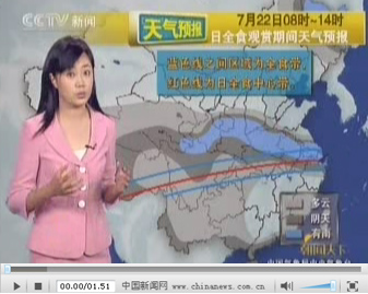 - 中新網報道:2009-7-22 09:58長江流域今天上午將出現(xiàn)罕見日全食,寶島臺灣也能看到日偏食,民眾相當期待,兩岸三地首次進行聯(lián)合現(xiàn)場轉播。