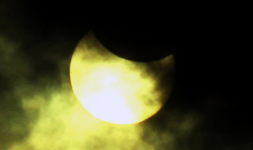 8時45分,天空出現(xiàn)大量薄云。伴隨云層越來越厚,天空變暗時,西北師大符彥飆博士說,有薄云和空氣的輕度污染,觀測相切不是很明顯;9時15分時,從蘭州可觀測到食甚,月球遮住太陽光面積達到最多,太陽“缺掉”80%。 有云層不失為一件好事,一童聲驚呼:“月亮”!透過厚厚的白云,此時用普通的觀測儀器,只能看見天空一片黑,用肉眼觀看是最好不過的了,符彥飆風趣道,“白天的月亮”。據符彥飆介紹,蘭州出現(xiàn)日偏食是在8時11分上演,持續(xù)了2個小時13分。完