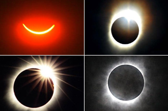 整個日食過程分五個階段,即初虧、食既、食甚、生光和復圓。(初虧:月球剛將太陽遮擋時,是日全食的前奏曲;食既:月球剛將太陽完全遮擋時,是全食精彩的開始;食甚:觀測地點進入了月球影子的最深處 ;生光:太陽剛開始“露臉”,是全食的結束;復圓:太陽剛開始露出“圓臉”)。