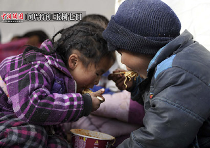 青海玉樹縣第三完全小學的帳篷學堂里學生們正在上課