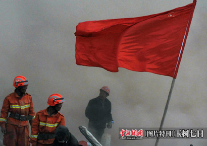 20日各地救援隊在結古鎮(zhèn)災區(qū)煙塵中堅持抗震救災
