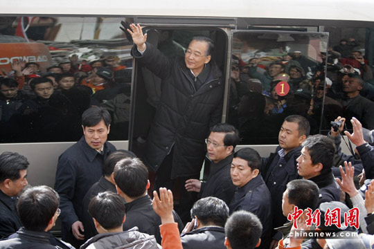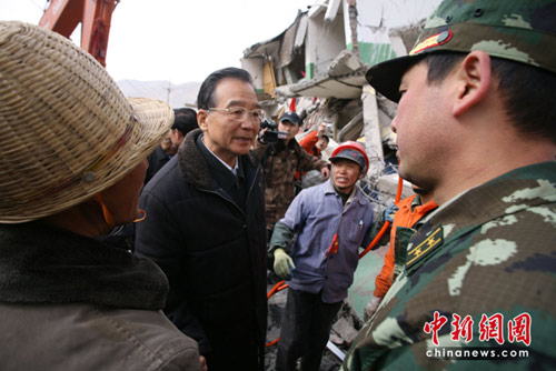 溫家寶玉樹災(zāi)區(qū)救援現(xiàn)場問候消防官兵