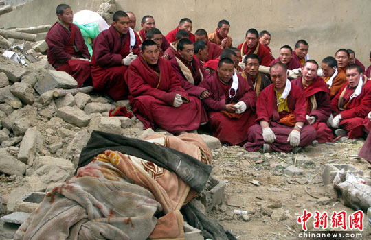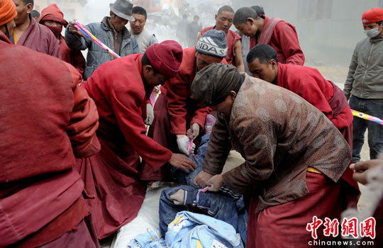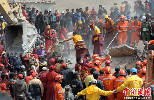 玉樹僧侶積極協(xié)助挖掘遇難者遺體