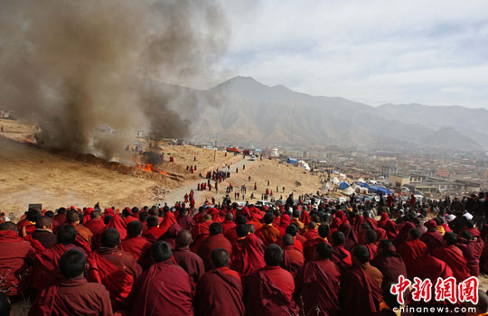 玉樹遇難者遺體火葬 僧侶為逝者祈禱