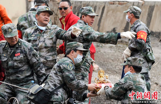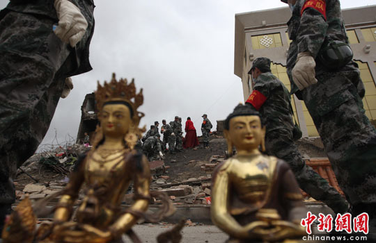 戰(zhàn)士為玉樹信眾清理地震廢墟中的法器
