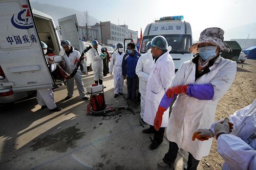 圖:玉樹地震廢墟消毒防疫工作展開