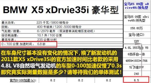 下面就說到我們的重點(diǎn)了,此次2011款寶馬X5xDrive35i車型在發(fā)動機(jī)上采用了型號為N55B30的單渦輪增壓發(fā)動機(jī),這套發(fā)動機(jī)系統(tǒng)也是寶馬最新研發(fā)出來的,之前在國內(nèi)的車型上僅有5系GT車型使用。特別需要說明的是這款發(fā)動機(jī)在搭配在車輛上后使得2011款寶馬X5的百公里加速僅需6.8S,僅比老款的4.8L V8發(fā)動機(jī)版的車系慢0.3S,但究竟實際加速度是多少呢?還要等我們的單獨(dú)測試后才知道。