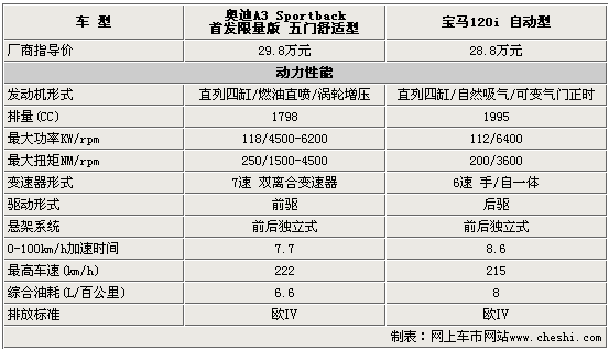 兩款車型的定位均為豪華運(yùn)動(dòng)型轎車,在性能方面自然互不相讓。通過上表我們可以清楚的看到,奧迪A3 Sportback首發(fā)限量版在性能上超越了寶馬120i,而寶馬120i憑借車身前后50:50的配重贏在了操控性上。奧迪A3 Sportback首發(fā)限量版搭載了7速雙離合變速器,這種變速器能更好的發(fā)揮發(fā)動(dòng)機(jī)的性能,體積更輕并且比手動(dòng)擋車型更省油。