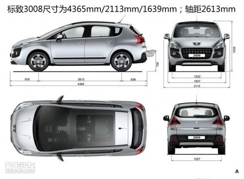 標致3008尺寸為4365mm/2113mm/1639mm;軸距2613mm,是一款標準的緊湊型Cross車型,采用了五門五座的設計。與國內的潛在對手途觀(4525/1809/1665mm,軸距2684mm)相比,3008車身更長更寬,但高度降低,與逍客的設計相似,這也不免讓我們擔心其頭部和后排空間。
