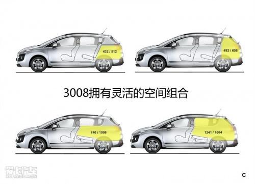 不過3008在空間的利用上非常出色,6/4分離的座椅設計可使得行李箱容積由512升擴充至1604升,另外擁有多種空間組合。