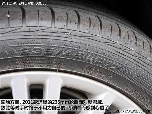 2011款邁騰有一項對性能影響很大的配置變化需要我們注意:2.0T的舒適型和豪華型換成了17寸的輪轂和235/45 R17的固特異單導向輪胎,相比之前215/55 R16的輪胎,直徑尺寸大了一個級別,寬度也增加了兩個級別,對性能的提升效果是非常明顯的,盡管有可能加速性能會稍差一些,但操控性和穩(wěn)定性會大幅攀升。