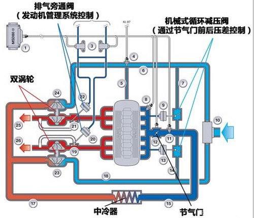 低轉(zhuǎn)速或者怠速的時(shí)候,排氣旁通閥完全關(guān)閉,所有的廢氣通過(guò)兩個(gè)輕質(zhì)小渦輪,獲得最大的增壓效果,提高低轉(zhuǎn)速下油門(mén)響應(yīng)性以及動(dòng)力輸出;在發(fā)動(dòng)機(jī)滿負(fù)荷的情況下,通過(guò)部分打開(kāi)排氣旁通閥以獲得一個(gè)比較恒定的增壓壓力,不增加耗油量。