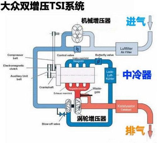 大眾TSI的含義:即Turbo-charging(渦輪增壓)、Super-charging(機械增壓)和Injection(燃油直噴)三個關鍵特色的首字母縮寫。也就是說,原汁原味的TSI,應當是具備三大技術的——渦輪與機械的復合增壓,加上缸內直噴技術。