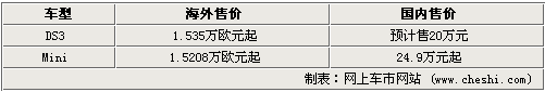 而在目前雪鐵龍DS系列車(chē)型僅有DS3一款,不出意外的話它將是長(zhǎng)安-標(biāo)致雪鐵龍推出的首款車(chē)型,預(yù)計(jì)將在2012年投產(chǎn)。DS3是一款雙門(mén)運(yùn)動(dòng)型小車(chē),競(jìng)爭(zhēng)對(duì)手則是Mini,在歐洲地區(qū)的售價(jià)1.5萬(wàn)歐元起。Mini在國(guó)內(nèi)的售價(jià)為24.9萬(wàn)元起(海外售價(jià)同樣是1.5萬(wàn)歐元起),考慮到DS3國(guó)產(chǎn)的原因,它的售價(jià)很可能會(huì)在20萬(wàn)元左右,比Mini要便宜一些。而在國(guó)產(chǎn)前,這款車(chē)也在4月的北京車(chē)展上亮相過(guò),看來(lái)是早有國(guó)產(chǎn)準(zhǔn)備。
