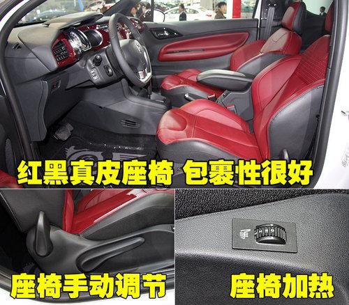 雪鐵龍DS3整車(chē)座椅均采用紅黑真皮材料,駕駛席座椅前后、靠背角度、座椅高度為手動(dòng)調(diào)節(jié)。各拉手四周做工較細(xì)致,沒(méi)有感覺(jué)到松垮的感覺(jué)。
