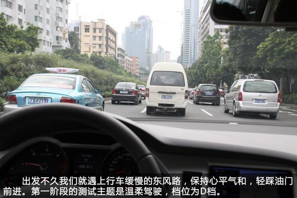 我們以D檔在市內(nèi)溫柔地行駛了約200公里,遇見(jiàn)紅燈必減速停車(chē),絕不嘗試僥幸通過(guò),堅(jiān)決不踩地板油,不急加速超車(chē),行車(chē)電腦顯示百公里平均油耗為9.1L。雖然與廠家公布的油耗數(shù)據(jù)有明顯出入,但面對(duì)這走走停停的路況,能維持在百公里9L左右的水平,可以了。另外補(bǔ)充一下,由于測(cè)試當(dāng)天廣州處于高溫狀態(tài),路上地面溫度估計(jì)超50度,所以全程開(kāi)空調(diào),消耗部分燃油。