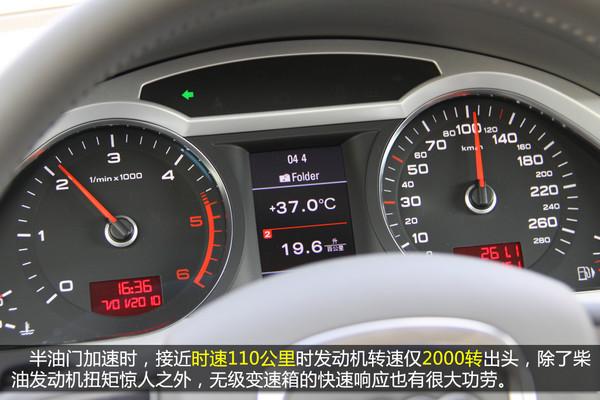 人多車(chē)多,廣州特色,都城已經(jīng)成為廣州人生活的一部分。面的蠕動(dòng)似的前進(jìn),發(fā)動(dòng)機(jī)轉(zhuǎn)速僅比怠速高一點(diǎn)點(diǎn)即可驅(qū)動(dòng)車(chē)輛前進(jìn)(約1200轉(zhuǎn)/分鐘),能把轉(zhuǎn)速控制在如此低的水平,正是柴油發(fā)動(dòng)機(jī)低速大扭矩的體現(xiàn)。但在這樣的環(huán)境中,并沒(méi)多少機(jī)會(huì)能給渦輪增壓系統(tǒng)發(fā)揮,渦輪打開(kāi)的轉(zhuǎn)速為1400轉(zhuǎn)/分鐘,憋屈著。由于轉(zhuǎn)速較低,加上奧迪出色的隔音做工,車(chē)內(nèi)非常安靜,聽(tīng)著B(niǎo)OSE音響美妙的樂(lè)章,就算路上再堵也能保持心情舒暢。