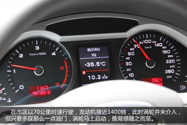 在市區(qū)內(nèi)以時(shí)速70公里行駛,發(fā)動(dòng)機(jī)轉(zhuǎn)速接近1400轉(zhuǎn),此時(shí)渦輪并未介入,但只要多踩那么一點(diǎn)油門(mén),渦輪馬上啟動(dòng),推背感隨之而至,70~100公里時(shí)速瞬間完成。