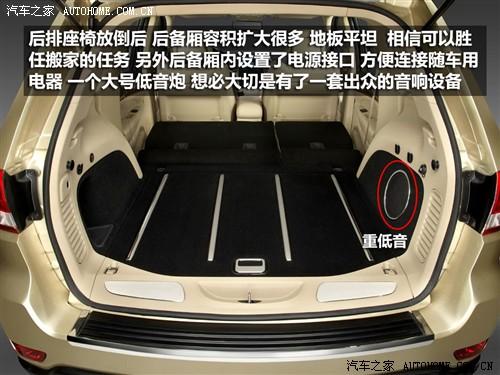座椅放倒后空間后備廂空間得到很大擴(kuò)大,放倒后地板平整,我想可以勝任搬家的任務(wù),如果用作旅行,后備廂容積足以放下你所需的物品,不是還有車頂行李架呢嘛?后備廂還這是了一個(gè)電源接口,方便隨車用電器連接使用。另外在后備廂內(nèi)發(fā)現(xiàn)了一個(gè)尺寸不小的低音炮,相信新款大切可以給我們帶來(lái)不錯(cuò)的視聽感受。