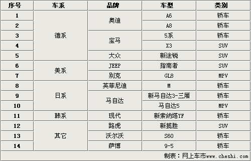從上表我們可以看出,德系換代車型占據(jù)大部分,同時A6、A8、5系、X3和新途銳這五款車型都可以稱得上是重量級車型。其次是美系和日系車型都將分別推出兩款和三款換代車型,JEEP指南者、別克GL8和英菲尼迪新M、全新三廂馬自達3和全新馬自達5,F(xiàn)代汽車也將推出全新一代的索納塔YF,這應(yīng)該是中國消費者接觸到的第三款車型了。同時路虎的新攬勝、沃爾沃的新S60和薩博全新9-5這些重量級車型也將相繼登場。在這些換代車型中轎車的比重比較大,共計8款車型。SUV為4款車型,MPV車型2款。