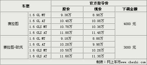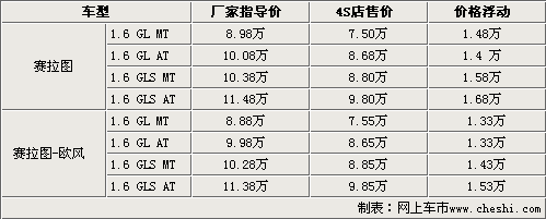 在調(diào)整完售價后,賽拉圖及賽拉圖歐風(fēng)GL低配車型的售價均降到了9萬元以下,完全進入了自主車型的售價區(qū)間。同時頂配車型的售價最高也不過11.5萬。與此同時更具網(wǎng)上車市價格監(jiān)測系統(tǒng)顯示,在廠家下調(diào)完售價后,賽拉圖及賽拉圖歐風(fēng)仍有很大的價格浮動,最高優(yōu)惠金額高達1.68萬。具體車型售價見下表: