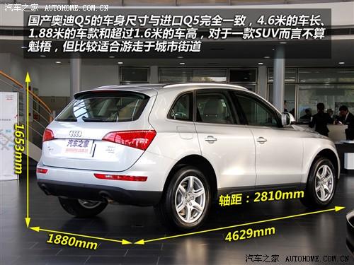 國(guó)產(chǎn)Q5的車身尺寸與進(jìn)口Q5完全一樣,長(zhǎng)×寬×高分別為4629×1880×1653mm,軸距為2807mm。與其同級(jí)對(duì)手如寶馬X3、奔馳GLK、沃爾沃XC60等車型尺寸接近。車內(nèi)空間算是比較寬敞了。輪轂尺寸與進(jìn)口版相比則明顯縮水,四款車型的輪轂依次分別為17、18和19寸,而進(jìn)口版卻是全系標(biāo)配了20寸的輪轂。