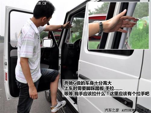 打開(kāi)車門后我們發(fā)現(xiàn),奔馳G級(jí)由于離地間隙比一般的SUV還要高出不少,因此上車的動(dòng)作難度也隨之加大了。不過(guò)幸好設(shè)計(jì)了車身側(cè)踏板,但如果能在A柱上安裝一個(gè)拉手,就能讓駕駛者感到更順心一些。