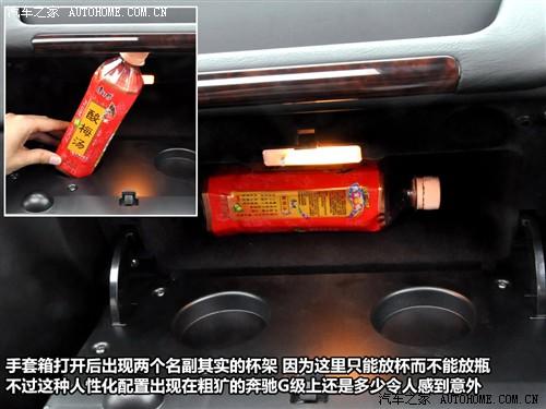然而一向粗枝大葉的奔馳G級也有考慮細致的一面。打開手套箱,放平的手套箱蓋就是一個可以放兩個杯子的托盤,為旅途時的小憩提供了方便。