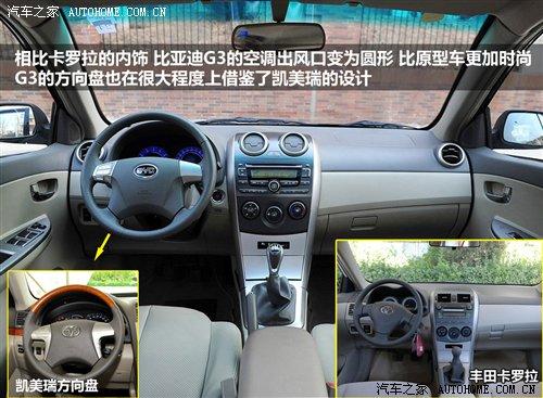 比亞迪F3的內(nèi)飾可以說(shuō)是豐田花冠的翻版,因?yàn)槌朔较虮P的造型不同之外并沒(méi)有其他不同,便宜的售價(jià)也限制了用料和材質(zhì);作為F3升級(jí)產(chǎn)品的G3,在內(nèi)飾方面也同樣由花冠升級(jí)為卡羅拉,但并沒(méi)有照搬過(guò)來(lái),比如空調(diào)出風(fēng)口的變化就顯得比原型車更加時(shí)尚,四輻方向盤也明顯帶有豐田凱美瑞的影子。