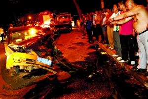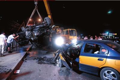 “有‘嗡嗡’的馬達(dá)聲,只看到一道黑影閃過!蹦繐粽叩耘空f,當(dāng)時(shí)酒仙橋路上一輛黑色轎車由南向北疾速行駛,“咣”地一聲悶響,迎面將一輛羚羊轎車撞得原地打轉(zhuǎn),隨后繼續(xù)前行。緊接著,不遠(yuǎn)處再次傳來碰撞聲,一輛逆向車道上的出租車“被黑轎車頂回去三四米”。黑轎車隨即變向,撞壞橋邊護(hù)欄墜河。