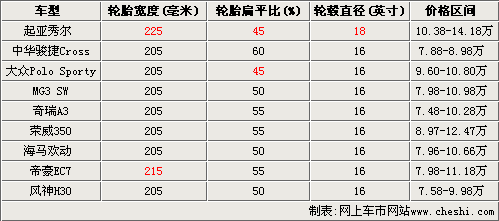 在以上車型之中,帝豪EC7系列全系都配備了215/55R16輪胎,各類尺寸參數(shù)都比較平均,所能影響的性能和舒適度在同級車中比較領(lǐng)先。另外,大眾Polo Sporty與秀爾一樣,是采用45較低扁平比的輪胎,提升了整車的運動氣質(zhì)。大體來看,奇瑞A3、榮威350等偏重家用的車型,輪胎扁平比都偏高,而海馬歡動、MG3 SW等偏向運動的車型,扁平比則略低。