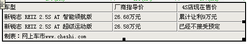 據(jù)北京一汽豐田4S店銷售人員介紹,目前銳志在售的2.5S車型全系可享受到3.5萬元的現(xiàn)金優(yōu)惠,銳志 REIZ 2.5S AT特別紀(jì)念和2.5S AT/MT特別導(dǎo)航版現(xiàn)車供應(yīng)充足,且主流的白、黑、紅、銀、蘭5種顏色齊全,另外店內(nèi)推出智能領(lǐng)航版車型,該車與銳志的超級(jí)運(yùn)動(dòng)版(26.58萬元)配置完全相同,整車集成了智能導(dǎo)航系統(tǒng)、倒車影像、三屏DVD、遠(yuǎn)程遙控啟動(dòng)系統(tǒng),車載冰箱、智能鑰匙系統(tǒng)、一鍵啟動(dòng)、秘密鍵盤鎖、自動(dòng)升窗、收鏡系統(tǒng)、安全防盜系統(tǒng)、引擎鎖定、智能升窗、震動(dòng)感應(yīng)、開門報(bào)警、行車下鎖、藍(lán)牙、運(yùn)動(dòng)擋泥板套裝等豐富配置,新增配置均為原廠配件。增配價(jià)值超出5萬元,該車市場指導(dǎo)價(jià)26.68元,現(xiàn)在購車優(yōu)惠4萬元,該車數(shù)量有限,喜歡銳志的朋友這個(gè)時(shí)候出手最值。其余車型均已停產(chǎn)不接受預(yù)定。銷售人員還表示:在售的這三款車型是豐田銳志賣的最火的也是性價(jià)比最高的三款車型。2011款的銳志9月上市,現(xiàn)開始接受預(yù)定,消費(fèi)者交訂金1萬便可排號(hào)提車。北京地區(qū)各4S店由于訂單不同,各店銷售的現(xiàn)車顏色有所不同。