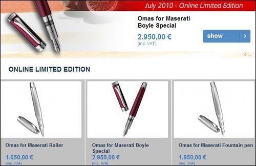 從上面的截圖可以看出,Omas for Maserati)簽字筆的售價(jià)為1650歐元,同樣銀色外觀(guān)的墨水筆售價(jià)為1850歐元,而B(niǎo)oyle Special是為紀(jì)念瑪莎拉蒂傳奇車(chē)型8 CTF而推出,限量生產(chǎn)70只,并且配合限量版8 CTF Boyle Special收藏車(chē)型一同發(fā)售。