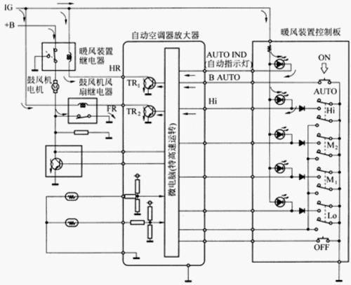 。1)鼓風(fēng)機轉(zhuǎn)速控制?照{(diào)系統(tǒng)ECU根據(jù)設(shè)定的溫度、車內(nèi)現(xiàn)有溫度、車外溫度、陽光強度、蒸發(fā)器皿溫度等信號,發(fā)送不同的指令給鼓風(fēng)機電機,并使之搭鐵,從而控制不同的鼓風(fēng)機轉(zhuǎn)速。對于一些恒溫空調(diào)系統(tǒng),當發(fā)動機啟動時或冷卻液溫度低于預(yù)定值,空調(diào)系統(tǒng)ECU使鼓風(fēng)機不起作用。