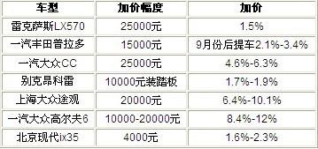 但是今年很奇怪,一邊是瘋狂降價(jià),一邊部分車(chē)型的加價(jià)情況愈演愈烈,尤其在省外市場(chǎng)上,2010款路虎攬勝5.0車(chē)型的加價(jià)額度在18萬(wàn)-20萬(wàn)元,雷克薩斯GX460的加價(jià)額度為11萬(wàn),加價(jià)幅度幾乎占到了車(chē)價(jià)的10%以上,據(jù)說(shuō)最高一個(gè)城市的加價(jià)比例為25%。