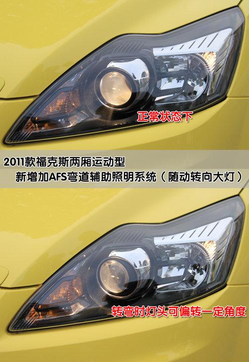 2011款?怂箖蓭\動型在安全配飾上新增加了AFS彎道輔助照明系統(tǒng),AFS是彎道輔助照明系統(tǒng)的縮寫(俗稱彎道大燈)。AFS系統(tǒng)有三種形式:1、轉(zhuǎn)向頭燈形式的,就是頭燈內(nèi)燈具可以左右旋轉(zhuǎn)8°至15°照明彎道死角。 2、利用獨立彎道照明系統(tǒng)的,就是在燈具里有一個固定的燈泡照向彎道,轉(zhuǎn)彎時候自動點亮。3、利用左右霧燈進行彎道時候照明,轉(zhuǎn)向時候?qū)?yīng)彎內(nèi)側(cè)霧燈亮起,照明彎道死角。而2011款福克斯兩廂運動型采用的是第一種形式,增強了夜晚行車的安全性。