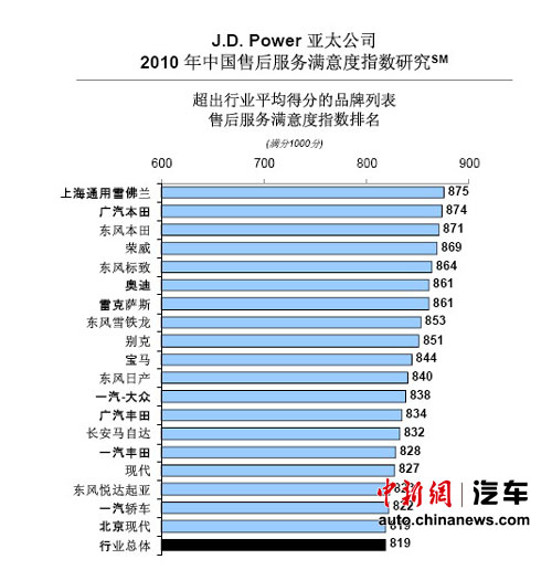 2010年中國售后服務(wù)滿意度指數(shù)研究的主要評價因子包括服務(wù)質(zhì)量、服務(wù)后交車、服務(wù)啟動、服務(wù)顧問以及服務(wù)設(shè)施等五項因子,以測評車主在購車的12至24個月期間,對品牌售后服務(wù)部門所提供保養(yǎng)和維修服務(wù)的滿意度進行評價。在此次研究中,廣汽本田以874分的總分(總分1000分)榮獲第二,僅以一分之差與冠軍失之交臂,但同比2009年結(jié)果(870分),分?jǐn)?shù)有進一步的提升。