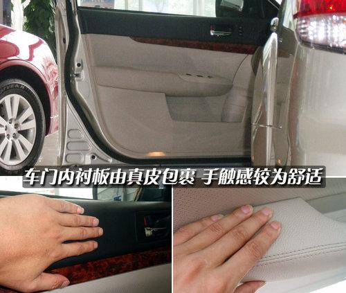 新傲虎車門內飾板上方采用了一般的軟性材料,手感一般,同時桃木面板裝飾增添了車內檔次。下方采用了米色真皮包裹,內部的填充物也較為厚實,手觸感非常舒適。