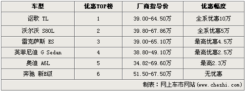 要說(shuō)寶馬全新一代5系LI車(chē)型的上市撼動(dòng)整個(gè)中級(jí)車(chē)市場(chǎng),這樣的說(shuō)法絕對(duì)不算嚴(yán)重。同級(jí)別車(chē)型都沒(méi)閑著,紛紛打出降價(jià)牌。排行榜中高居榜首的是本田的高端品牌謳歌TL車(chē)型,以全系優(yōu)惠10萬(wàn)元的巨大幅度拔得頭籌;中間分列二三四五位的是沃爾沃S80L:全系優(yōu)惠5萬(wàn)、雷克薩斯ES:最高優(yōu)惠4.5萬(wàn)、英菲尼迪G系列:最高優(yōu)惠2.5萬(wàn)、奧迪A6L最高優(yōu)惠2.3萬(wàn)。唯一一款沒(méi)有降價(jià)的車(chē)型是奔馳剛剛上市才不久的國(guó)產(chǎn)新E級(jí),全系沒(méi)有優(yōu)惠政策,購(gòu)車(chē)需預(yù)定。