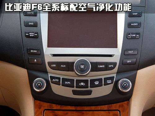 比亞迪F6長4846mm,寬1822mm,高1465mm的車身,2740mm的軸距,提供寬敞舒適的的駕乘空間;同時(shí)也提供了高端配置。例如在駕乘舒適性方面,F(xiàn)6新財(cái)富版2.0L尊貴型擁有雙層雙模天窗、雙溫區(qū)獨(dú)立控制自動(dòng)空調(diào)、方向盤音響控制系統(tǒng)、DVD多媒體系統(tǒng)以及NAVI語音導(dǎo)航系統(tǒng)等配置。
