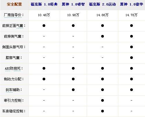 在安全配置方面,兩車(chē)的入門(mén)版車(chē)型基本保持在同一水平,正副駕駛雙安全氣囊和ABS+EBD也是目前主流的入門(mén)車(chē)型安全配置。而在較高配車(chē)型上,?怂乖谥鲃(dòng)安全上有一定優(yōu)勢(shì),其運(yùn)動(dòng)版車(chē)型擁有牽引力控制和電子穩(wěn)定程序。翼神則在被動(dòng)安全性上出色一些,側(cè)面頭部氣簾僅出現(xiàn)在?怂谷龓廊A型上,而全系標(biāo)配的膝部氣囊在?怂沟娜刀紱](méi)有配備。