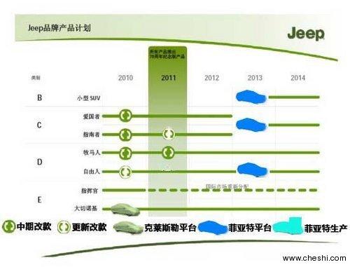 通過(guò)Jeep近兩年的產(chǎn)品規(guī)劃圖可以看出,Jeep自由人將于2013年開(kāi)始使用菲亞特生產(chǎn)平臺(tái)前,而且在明年還將推出新款自由人。Jeep牧馬人將于明年推出70周年紀(jì)念版車(chē)型,并且一直持續(xù)生產(chǎn)。除Jeep指揮官將于2010年末停產(chǎn)外,Jeep大切諾基將繼續(xù)保持克萊斯勒血統(tǒng)一直生產(chǎn),并且新款大切諾基將于今年年底引入國(guó)內(nèi)。
