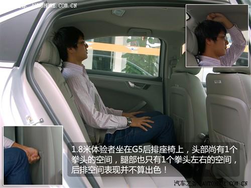 很多人考慮G5的另一個因素是它中型車尺寸帶來的良好空間,不過實際上它的軸距只有2700mm,在中型車中屬于中下水平,實際乘坐也是如此,身高180cm的體驗者坐入后排,頭頂和腿部都只有一拳左右的空間。不過較長的車尾也提供了不錯的行李箱空間。