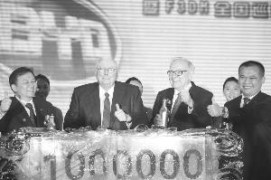 比亞迪總裁王傳福(左一)、巴菲特(右一)等出席比亞迪汽車第100萬(wàn)輛銷售慶典 上海證券報(bào)傳真圖