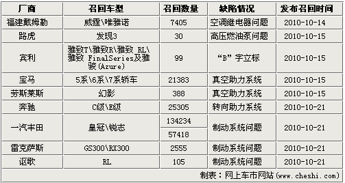 從上面的統(tǒng)計(jì)表可以看出,從10月14日開始召回公告頻頻發(fā)布,僅15日一天就有4個品牌實(shí)施召回,而它們還是市場中的豪華品牌甚至超豪華品牌如勞斯萊斯、賓利,奔馳、寶馬也沒有落后分別召回其主力車款寶馬5系、7系和C級、E級。曾備受關(guān)注的豐田品牌再次實(shí)施召回,這次是皇冠和銳志總召回接近20萬輛。而在召回原因中,制動系統(tǒng)問題占了很大的比重,這點(diǎn)有點(diǎn)令消費(fèi)者擔(dān)心。