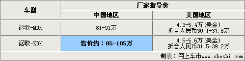 謳歌SUV車型MDX和謳歌跨界車ZDX同屬于一個(gè)級(jí)別的車型,它們的軸距都是2750mm。但是謳歌ZDX的車身要比MDX長(zhǎng),而身高度則低于MDX,這樣的設(shè)計(jì)完全符合跨界車(運(yùn)動(dòng)型多功能跑車)的定位。目前謳歌MDX在中國(guó)地區(qū)的售價(jià)為81-91萬(wàn),通過謳歌MDX在美國(guó)地區(qū)的售價(jià),我們預(yù)計(jì)謳歌ZDX引入中國(guó)地區(qū)的售價(jià)約為85-105萬(wàn)(謳歌ZDX目前美國(guó)地區(qū)的指導(dǎo)價(jià)為4.5-5.6萬(wàn)美金,折合人民幣為31.5-39.2萬(wàn)元)。