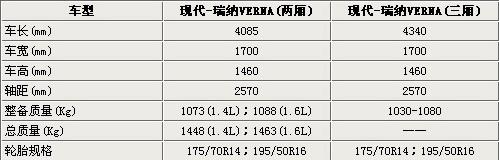 現(xiàn)代瑞納VERNA與i20同平臺生產(chǎn),兩廂車型在前臉設計上與三廂不會有太大的不同,車身尺寸上除了長度外,其他與三廂車型基本相同,三廂版瑞納,寬為1700mm,高為1460mm,軸距為2570mm,車身比雅紳特要大了不少。關于兩廂版瑞納的詳細信息請參見下表: