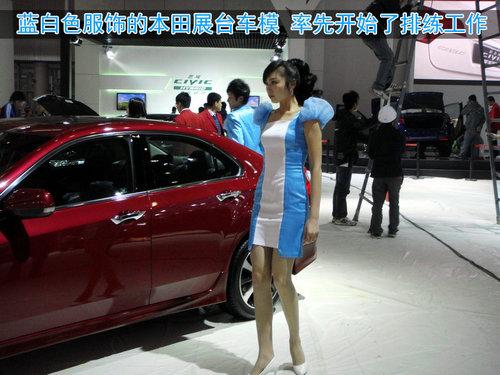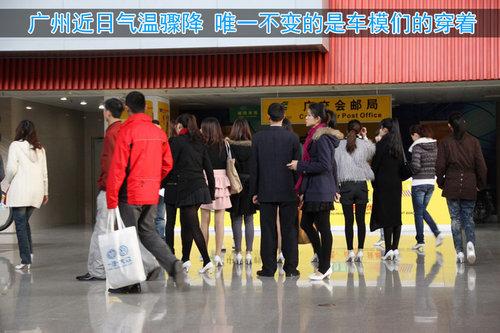 車模的誘惑力往往更大,雖然距離車展還有2天,但她們已經(jīng)開(kāi)始了排練試演,于此同時(shí)在她們身后的一些車輛卻成了陪襯。外近日廣州的氣溫驟降,白天大約在10幾度,許多人增添了較厚的衣服,但車模們依舊短裙出鏡。